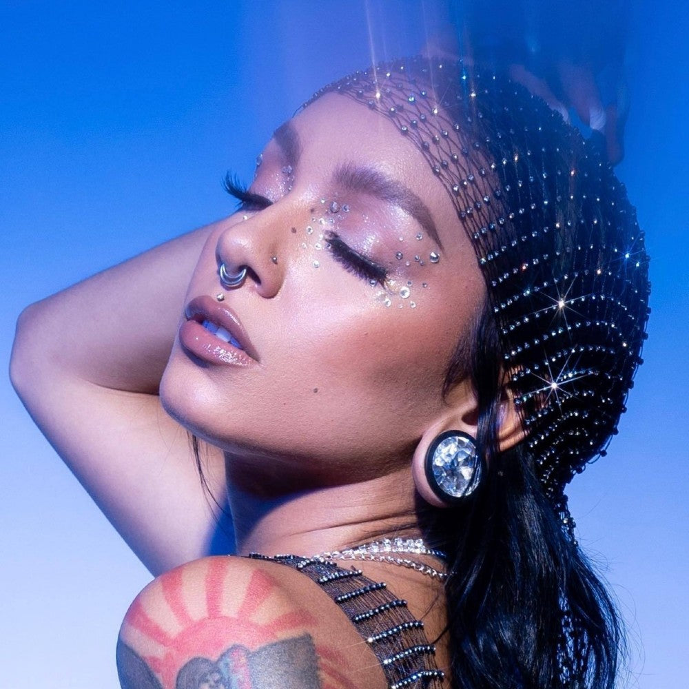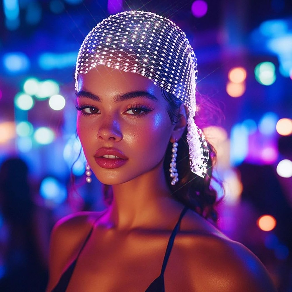 This stunning headpiece features a delicate, fishnet-style design adorned with shimmering rhinestones, creating a captivating sparkle with every movement. The lightweight and comfortable construction ensures a perfect fit, making it ideal for all-day wear at festivals, parties, or special occasions.